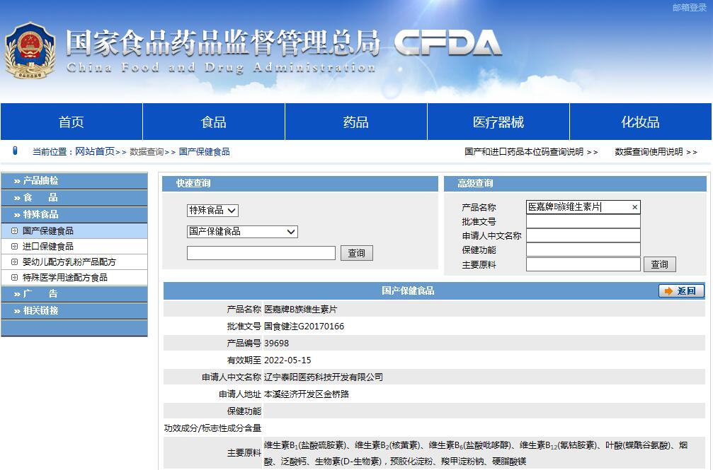 另外還可以直接到國(guó)家局的網(wǎng)站直接查詢,比如醫(yī)嘉牌B族維生素片。